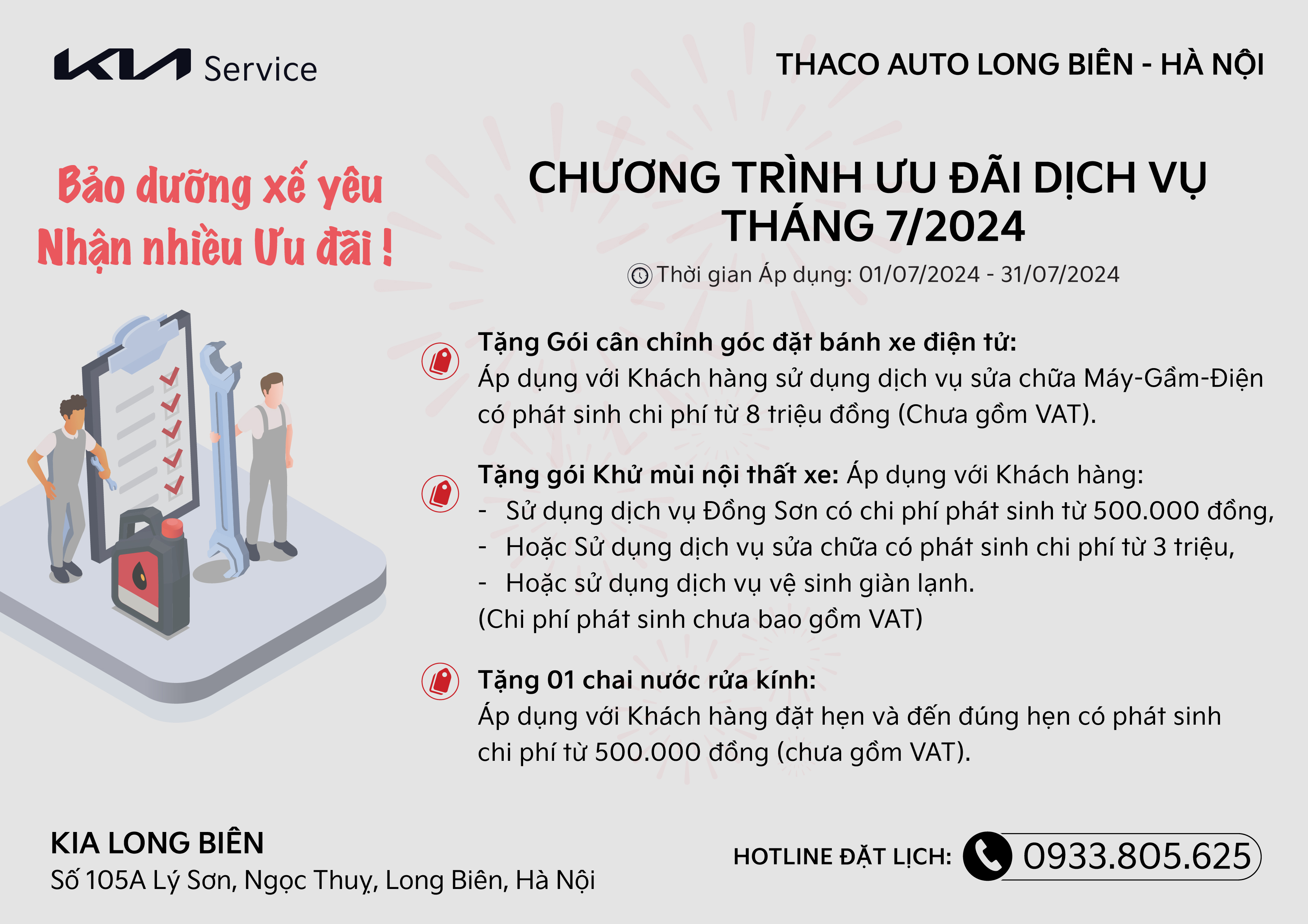 💝 Chương trình Ưu đãi dịch vụ trong tháng 6/2024 của Kia Long Biên được sự đón nhận nhiệt tình từ Quý khách hàng với những Ưu đãi thiết thực. Do đó tháng 7 này, Kia Long Biên tiếp tục triển khai chương trình "Bảo dưỡng xế yêu - Nhận nhiều Ưu đãi" đến hết 31/07/2024 dành tặng cho tất cả Quý Khách hàng đến sử dụng dịch vụ sữa chữa và bảo dưỡng xe tại địa chỉ số 105A đường Lý Sơn, Ngọc Thuỵ, Long Biên, Hà Nội.